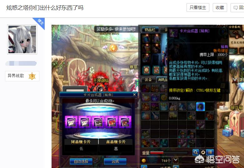 DNF5.23日更新之后,亡者峡谷加入了全新的摸金进图眩惑之塔,眩惑之塔除了可以掉落哈林传说史诗之外,还可以掉落一些卡片和卡片合成器之类的一些道具,正好今天也是眩惑之塔第七天,很多玩家都把贮藏箱的粉卡和稀有合成器拿了出来,看看自己能不能变成欧皇。