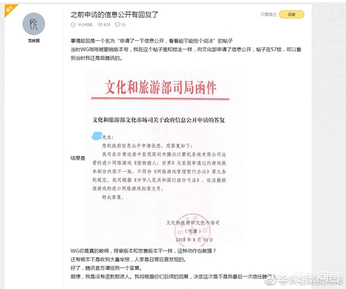 那么腾讯《怪物猎人:世界》游戏到底是什么原因导致被下架的呢?有网友落蝉翼向游戏监管部门申请了信息公开,并得到了文化和旅游部文化市场司的回复,官方给出的解答如下: