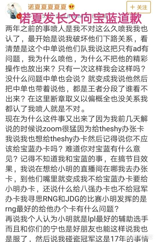 最近一段时间LPL圈内可以说是节奏不断,前两天JDG前辅助诺夏在与记得直播中被套路,说出了宁愿给史森明办卡也不给宝蓝办卡这样的言论,被纠出两年前直播中怒喷尚未成名的宝蓝,引发了IG粉丝的强烈不满,就在刚刚诺夏公开在微博上发文向宝蓝道歉,但是从评论来看粉丝似乎并不买账。