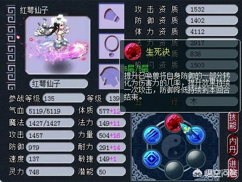 血攻宝宝:因为生死决有负面状态,降低自身的防御,所以既然都降低了自身防御了就需要血量的支撑,不然生存能力堪忧,所以血攻很适合打生死决内丹。并且生死决即便是在满成长坐骑统驭之下触发几率也仅仅只有9%,所以多回合作战情况下收益会更高一些,血攻意味着能多站几回合,也就有更高的几率触发生死决。