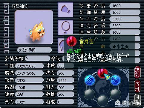 超级神狗的特殊技能有:理直气壮和高级独行。效果分别是有40%几率攻击三次,物理伤害效果降低20%;不会合击且抗封增加50%。