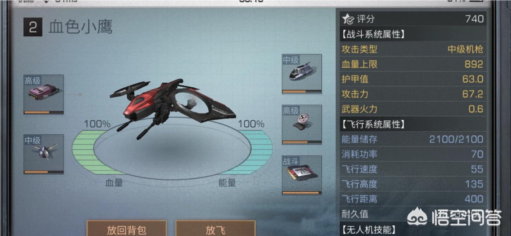 由于咱们的基础无人机装了“基础无人机芯片”,所以该无人机就是基础无人机了。如果我们把“基础无人机芯片”替换成“战斗芯片”,那么我们的无人机就变成“血色小鹰”这款战斗无人机了。也就是说,决定无人机种类的就是这个无人机芯片的类型了。